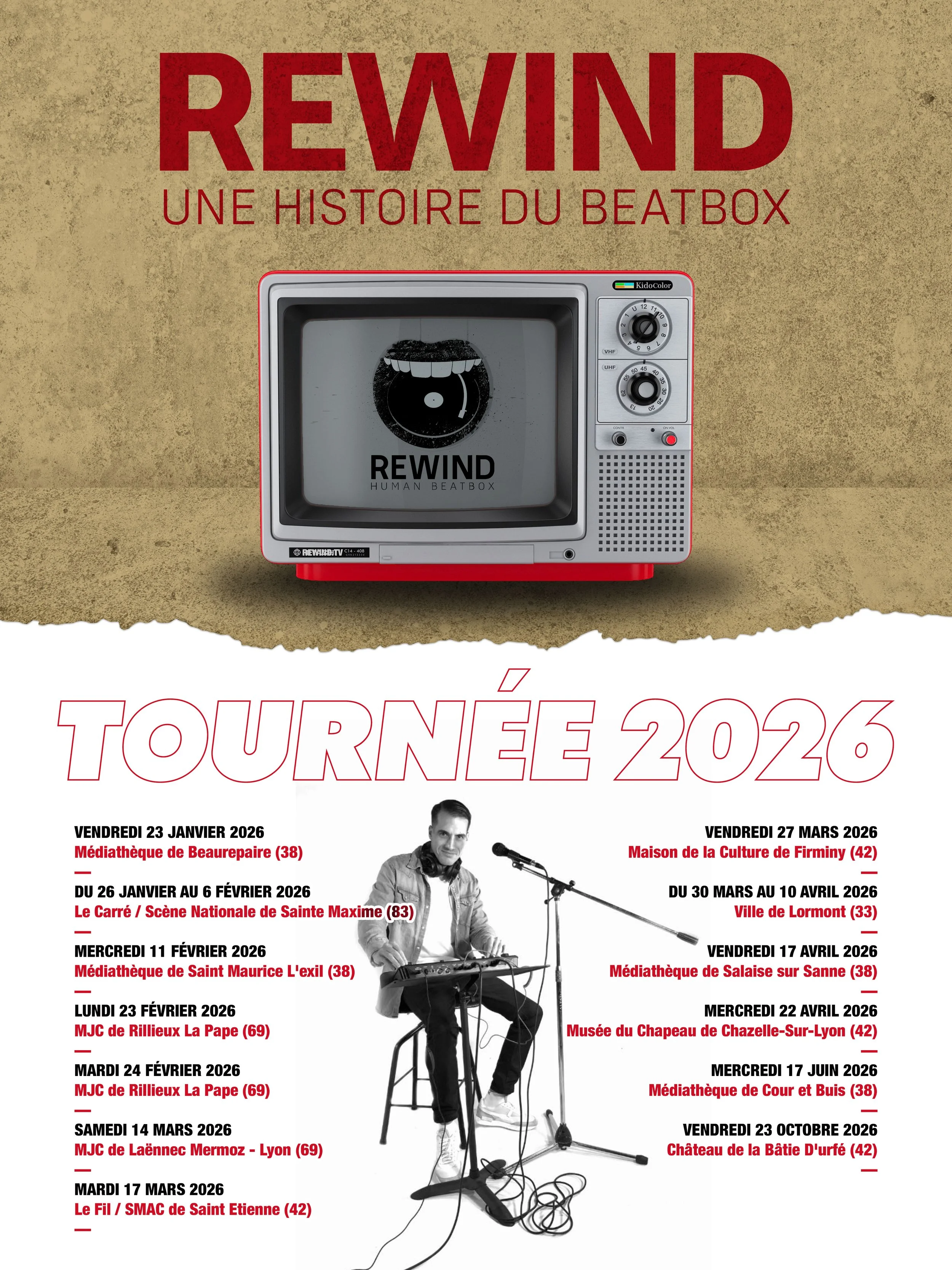 Un micro, une voix, et tout un orchestre imaginaire surgit! Willy AMARAT alias Rewind nous embarque dans l’univers bluffant du Human Beatbox. Seul en scène, il imite percussions, basses et mélodies, crée des morceaux en direct grâce à sa voix et une loopstation. A travers performance, anecdotes et initiation ludique, il raconte l’histoire de cet art apparu dans les années 80 via le mouvement Hip Hop. Passionné et pédagogue, il transmet une musique vivante et accessible, née du souffle et du corps.